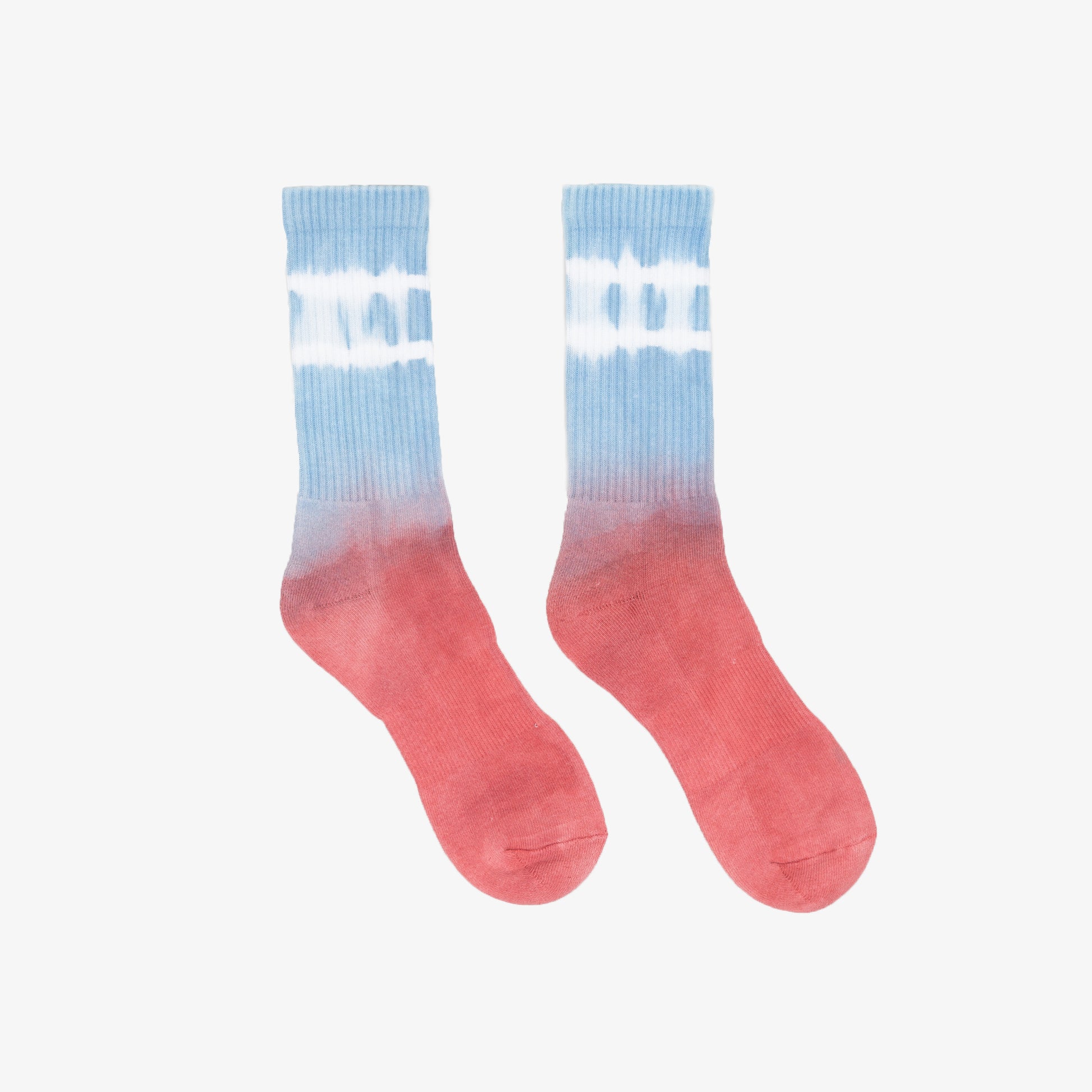 Free of artificial preservatives these socks are all naturally hand dyed with elements from the earth. The “Firecracker” colorway, inspired by a childhood popsicle favorite, features a classic two stripe accent with a Light Blue to Cranberry Red blend. Reminiscent of those carefree innocent days. Naturally dyed with madder root and organic indigo.