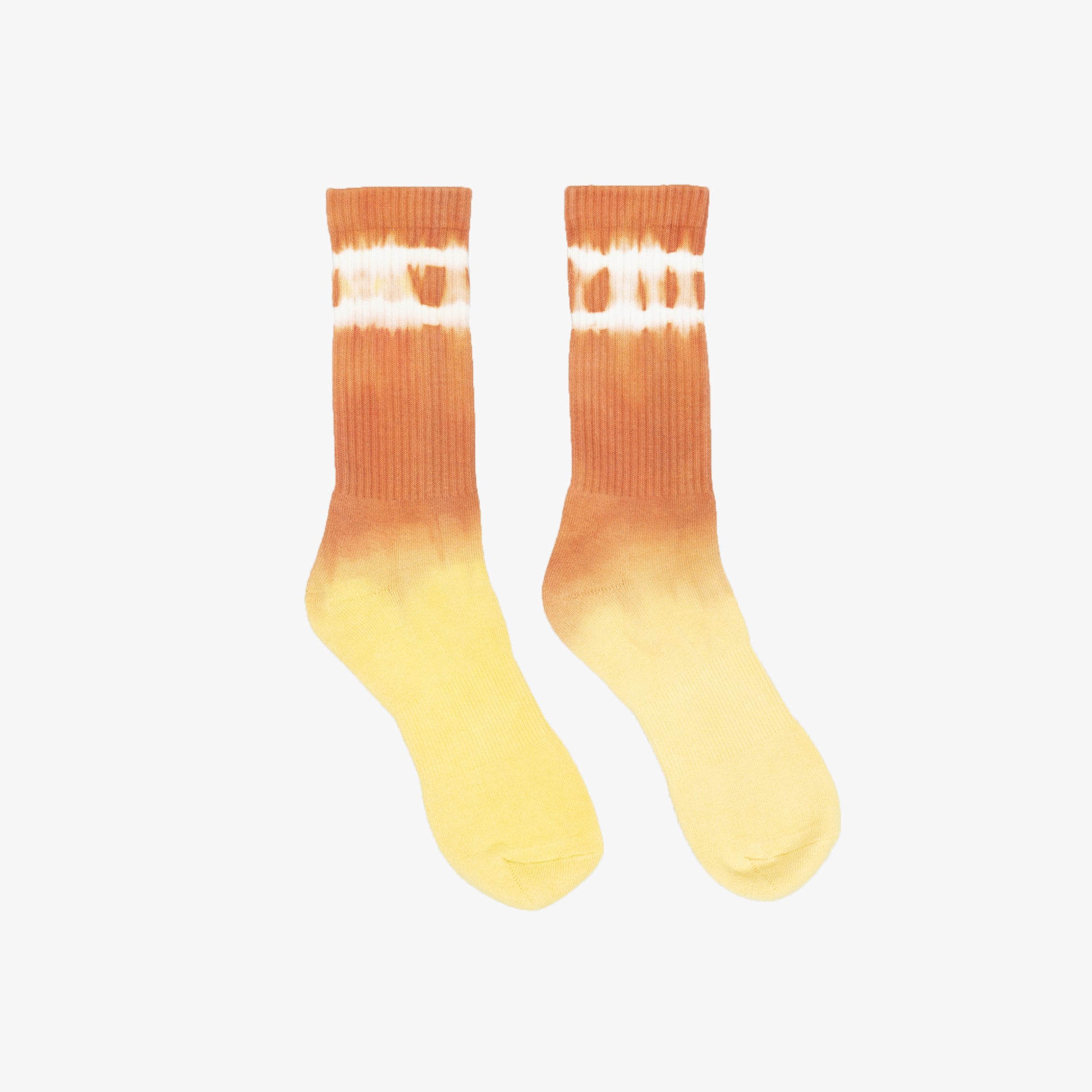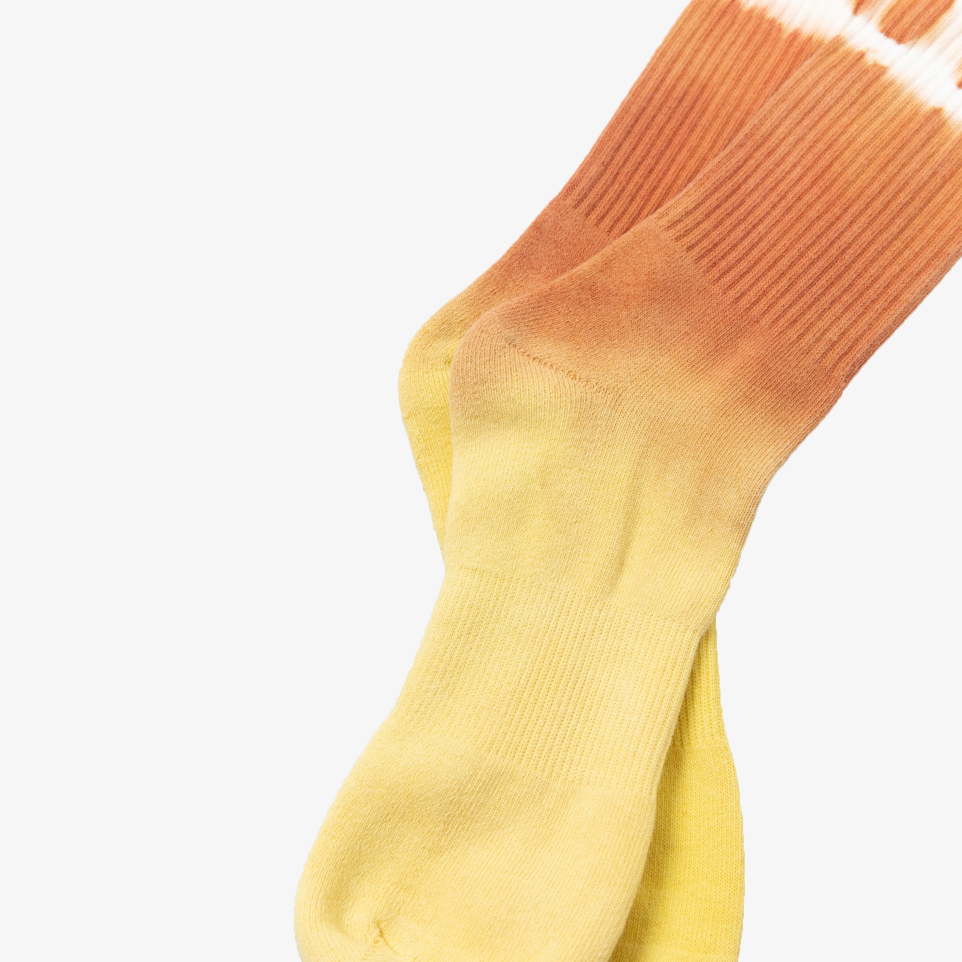 The Suns Irrupt! Or at least according to Neon Indian. A burst of warm light, from sunrise to sunset. The “Sunburst” colorway is inspired by those long yet hopeful Summer days. Let these socks hug you just as the sun does. Featuring the classic upper two stripe accent with an Orange to Yellow Blend. Naturally dyed with eucalyptus, madder root, cutch, and weld.